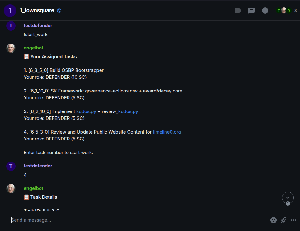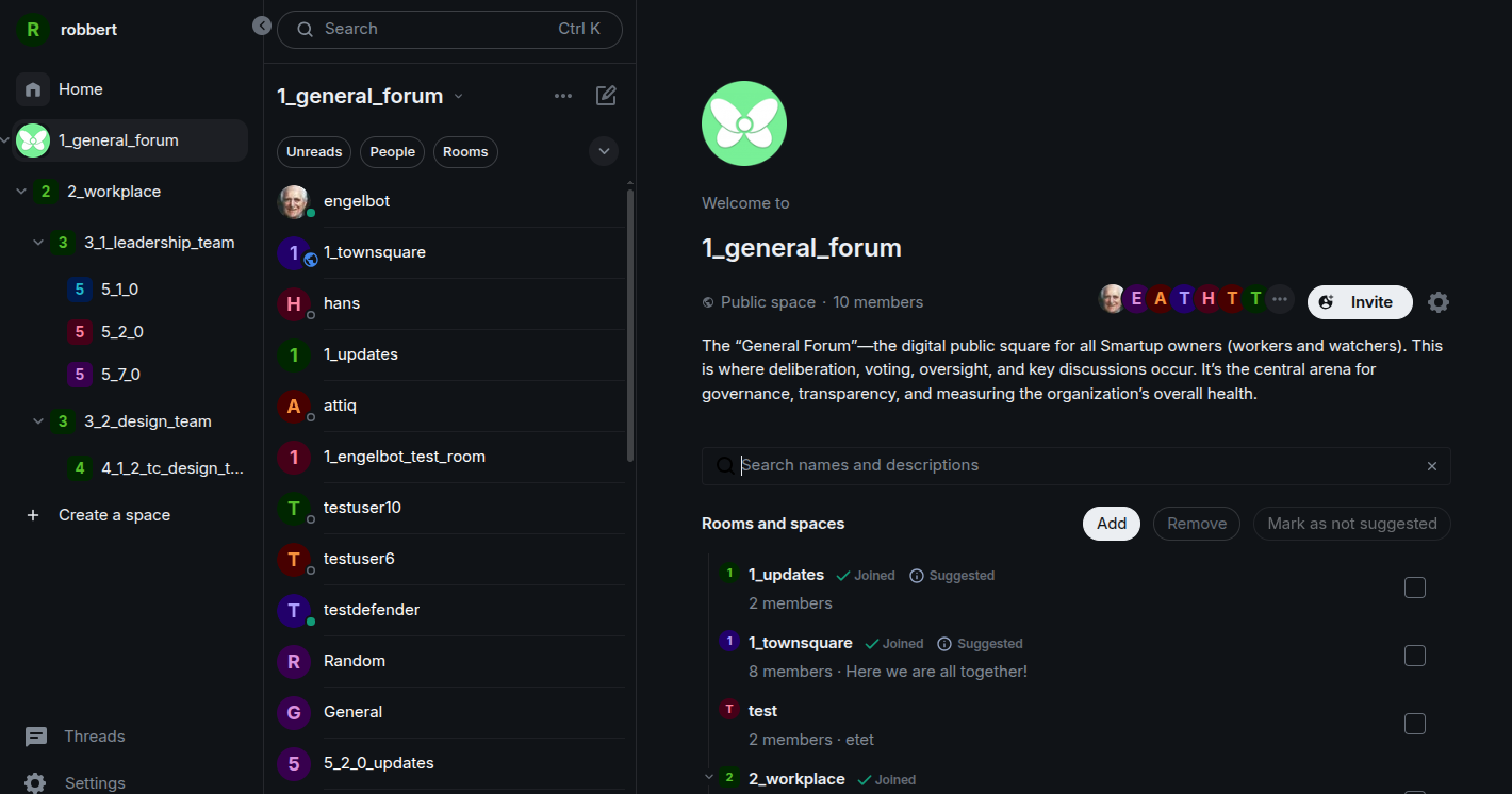 SmartupOS uses Element (a chat client) running on a custom Synapse server (Matrix protocol). To maintain a secure laboratory environment, our server operates as a "defederated island"—completely cut off from the wider internet. Access is strictly token-only. Inside, the chat interface is rigidly structured into Spaces and Rooms that perfectly mirror our 6 Groups of Productivity, serving as the interface where citizens debate, coordinate, and trigger Engelbot commands.